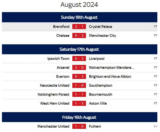 英超首轮只剩热刺、莱斯特未踢,布莱顿暂领跑,曼城、利物浦、阿森纳、曼联均开门红。