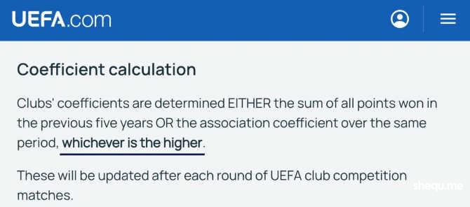 原因很简单,欧足联的俱乐部系数有两种计算方法,一种是根据球队在欧冠、欧联和欧协联获胜或战平而取得的积分,例如赢下一场小组赛可以获得2分,打平一场小组赛则是1分;另一种方法则是球队所在足协的协会系数的20%;两种方法计算而来的数字进行大小比较,以较大的数字作为球队的俱乐部系数。